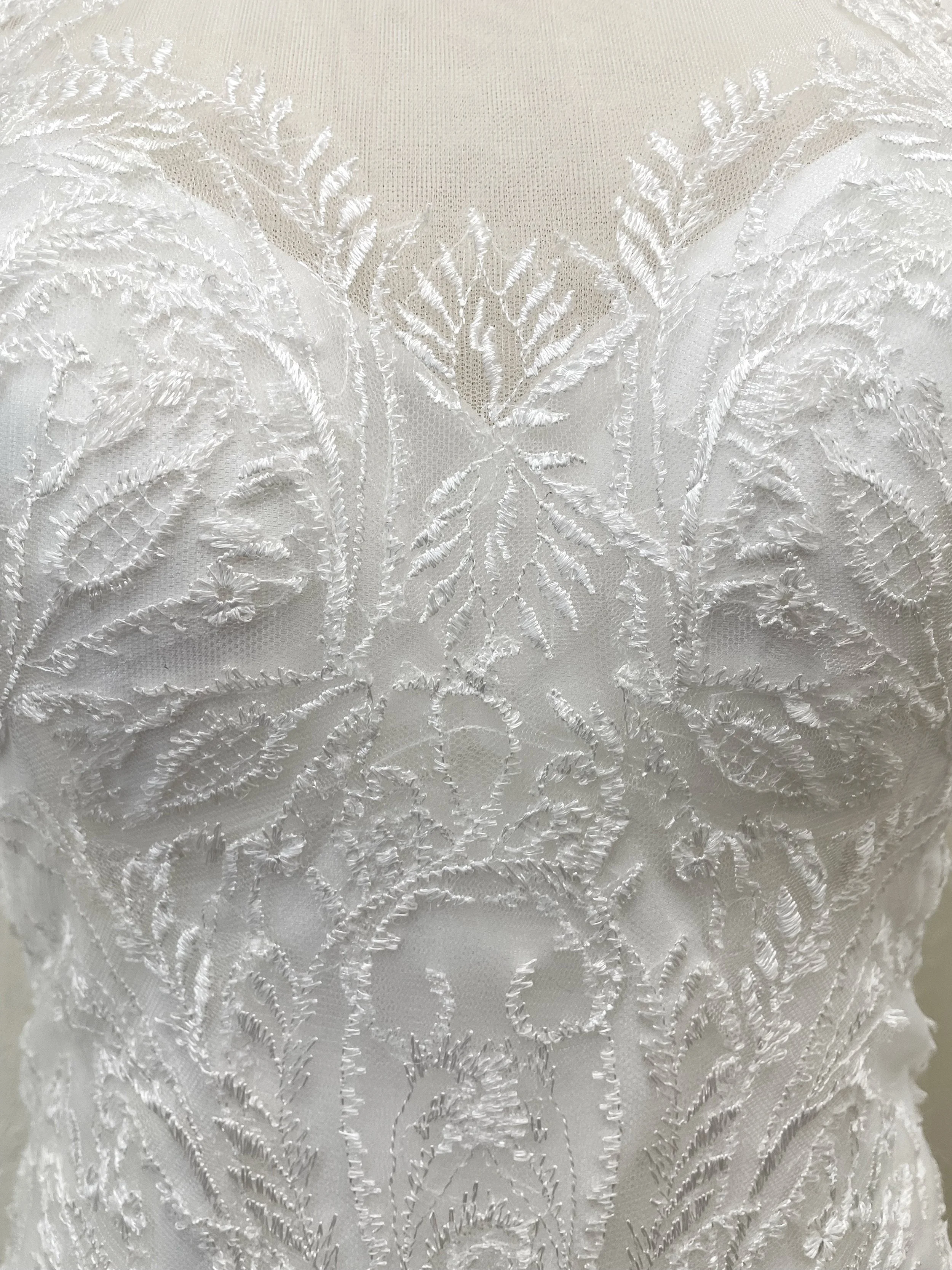 A stunning illusion halter neckline and dramatic open back add a dose of glamour to this lace sheath wedding dress, adorned with exquisite lace appliques on tulle. Finished with covered button over zipper closure.